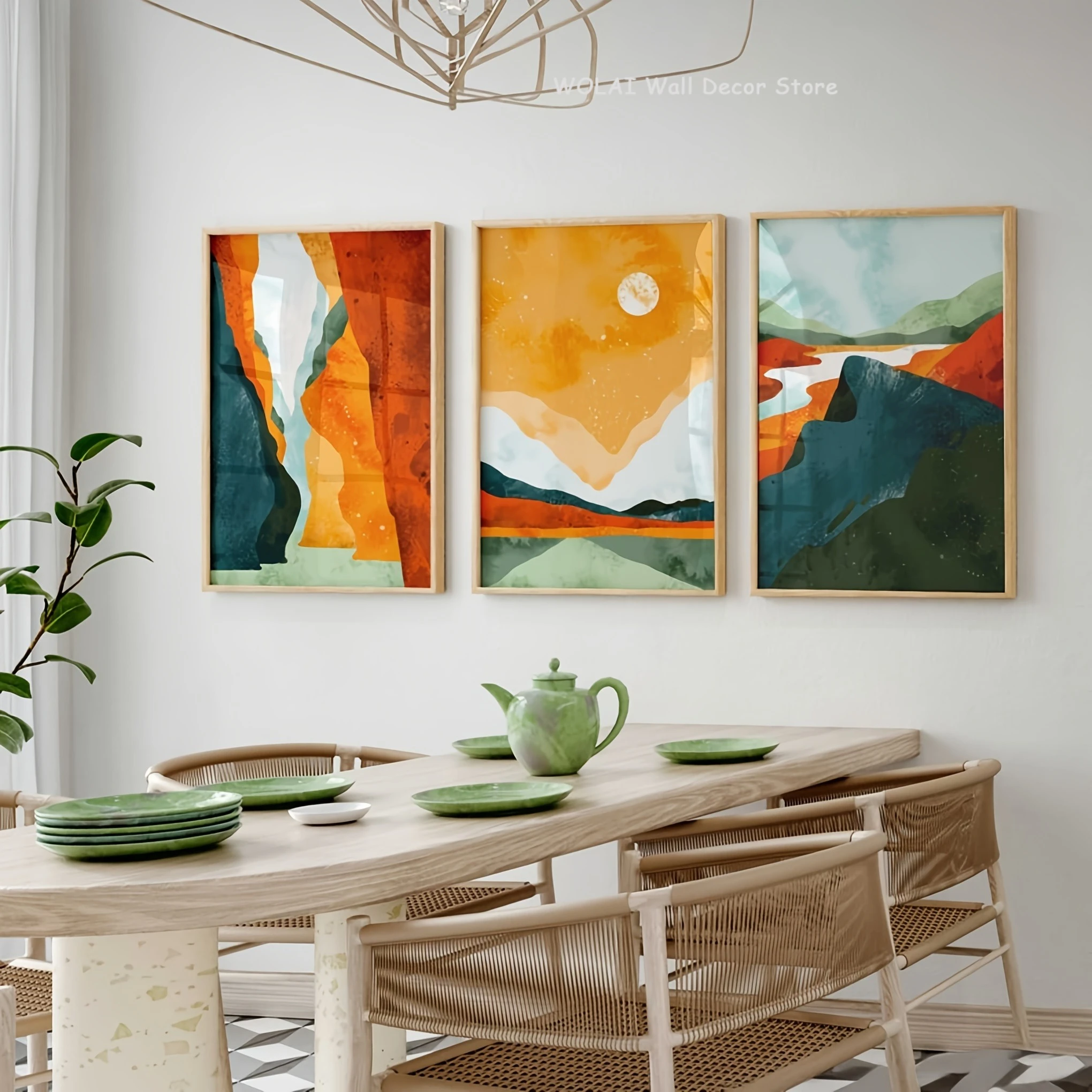 This 3-piece canvas art set features abstract Bohemian sun and mountain illustrations, perfect for adding a modern and artistic touch to living rooms, bedrooms, or office spaces. Made from durable canvas, these prints create a stylish, vibrant focal point on any wall, blending contemporary design with a warm, decorative aesthetic.